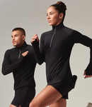 88% polyester/12% elastane peached interlock. Single jersey with wicking finish. Stand up self fabric collar. Raglan sleeves with flatlock stitching. 1/4 length zip with chin guard and reflective trim. Reflective detail on back of shoulder seams. Concealed zip key pocket on left back panel seam, with inner headphone access. Side panels. Elasticated bound cuffs and hem. Thumbholes and fold over cuffs. Tear out label.