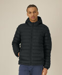 Men’s padded jacket. Medium fit. Set-in sleeve. High collar with a grown-on hood. Adjustable hood opening and bottom hem with plastic stopper and elastic cord. Reverse nylon zip at centre front. Zipped welt pockets with extra grosgrain puller. Fully quilted. Side panels for a better shape. Self-fabric elasticated cuff. Inside seams with binding finish.